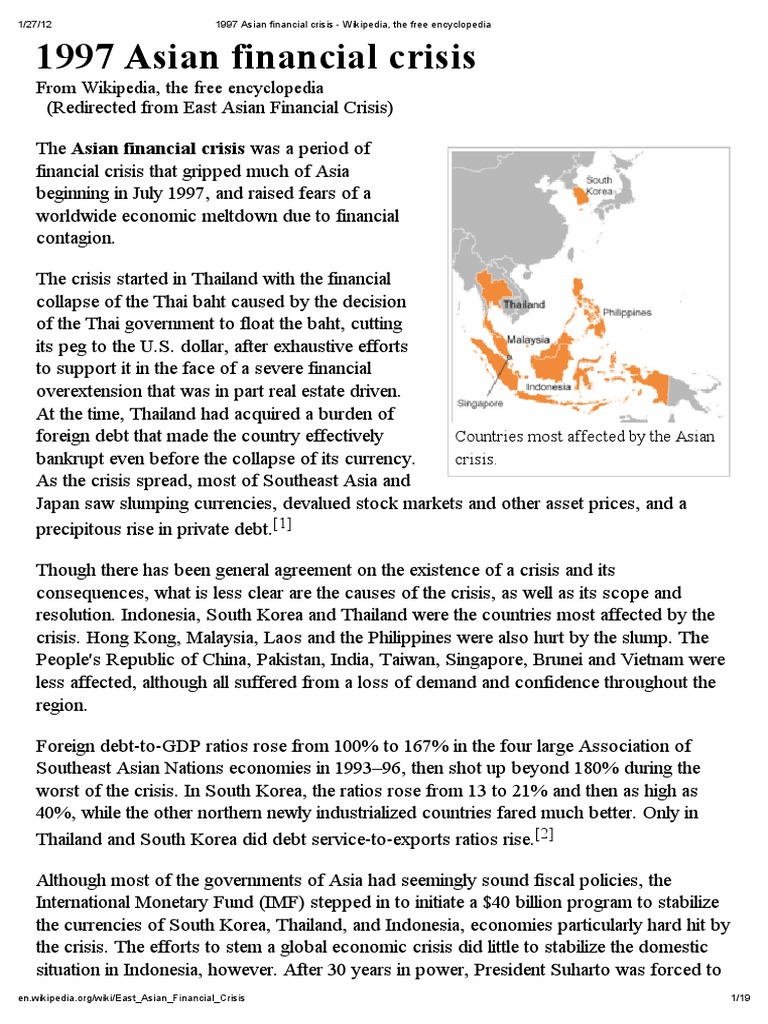 Allow insolvent banks and financial institutions to fail. This is proof that there are still a few lessons yet to be learned to prevent future crisis from happening. The asian financial crisis of 1997 affected many asian countries, including south korea, thailand, malaysia, indonesia, singapore, and the philippines. However, in a very short span of time the crisis had gripped the entire south east asian region. The malaysian ringgit was subject to attack by speculators within days of the baht's devaluation. This is worse than the financial crisis. Asian economic outlook before the crisis outline4. As a result of the devaluation of thailand's baht, a large portion of east asian currencies fell by as much. The 1997 asian financial crisis began when the thai baht went into a tail spin. The most important lesson that keeps recurring as a major mistake in almost every. The assumption was that the conditions that lead to the thai economic crisis was also found in malaysia. The asian crisis sent ripples across financial markets all over the world. The asian financial crisis was a period of financial crisis that gripped much of east asia and southeast asia beginning in july 1997 and raised fears of a worldwide economic meltdown due to.