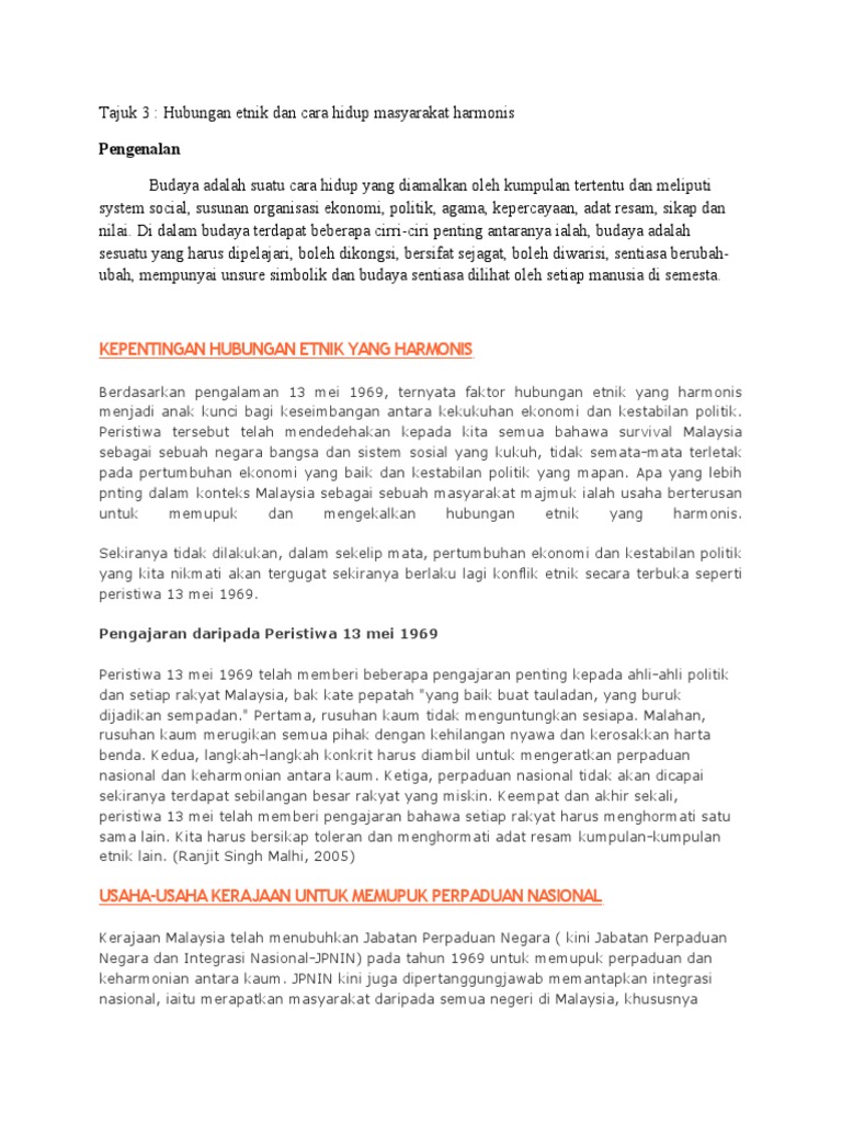 Ketika ini, peristiwa 13 mei hanya disebut secara ringkas dalam buku teks tingkatan lima tanpa membincangkan kejadian sebenar dengan terperinci. Walau bagaimanapun kita mempunyai sejarah berdarah yang melibatkan 2 kaum uatama di malaysia iaitu. Bahasa kebangsaan, kedudukan istimewa orang melayu. Semua masyarakat haruslah berganding bahu dalam membantu mewujudkan negara yang harmoni. Kesepaduan dalam kepelbagaian 1.0 pengenalan dalam bab ini, hubungan etnik akan memberi tumpuan kepada bentuk, tahap, tingkat dan penekanan terhadap hubungan antara kumpulan etnik yang wujud dalam sesuatu masyarakat dengan negara itu.